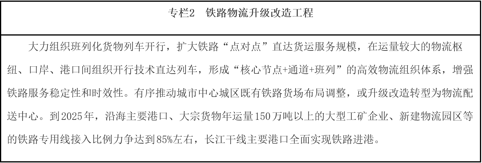 推進結構性降成本。加快推進鐵路專用線進港區(qū)、連園區(qū)、接廠區(qū),合理有序推進大宗商品等中長距離運輸“公轉鐵”、“公轉水”。完善集裝箱公鐵聯(lián)運銜接設施,鼓勵發(fā)展集拼集運、模塊化運輸、“散改集”等組織模式,發(fā)揮鐵路干線運輸成本低和公路網(wǎng)絡靈活優(yōu)勢,培育有競爭力的“門到門”公鐵聯(lián)運服務模式,降低公鐵聯(lián)運全程物流成本。統(tǒng)籌沿海港口綜合利用,提升大型港口基礎設施服務能力,提高碼頭現(xiàn)代化專業(yè)化規(guī)模化水平,加快推進鐵水聯(lián)運銜接場站改造,提高港口鐵路專用線集疏網(wǎng)絡效能,優(yōu)化作業(yè)流程。完善內河水運網(wǎng)絡,統(tǒng)籌江海直達、江海聯(lián)運發(fā)展,發(fā)揮近海航線、長江水道、珠江水道等水運效能,穩(wěn)步推進貨物運輸“公轉水”。推進鐵水聯(lián)運業(yè)務單證電子化,促進鐵路、港口信息互聯(lián),實現(xiàn)鐵路現(xiàn)車、裝卸車、貨物在途、到達預確報以及港口裝卸、貨物堆存、船舶進出港、船期艙位預定等鐵水聯(lián)運信息交換共享。支持港口、鐵路場站加快完善集疏運油氣管網(wǎng),有效對接石化等產業(yè)布局,提高管道運輸比例。
