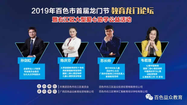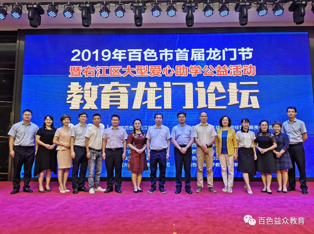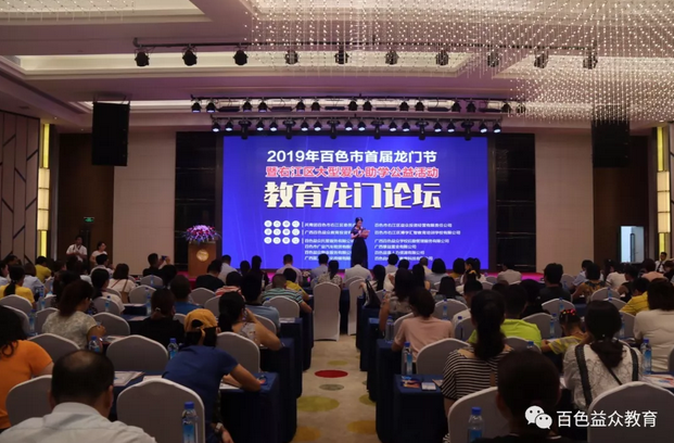 2019年6月16日下午,百色市首屆龍門節(jié)暨右江區(qū)大型愛心助學(xué)第一場公益活動(dòng)—教育龍門論壇的舉行,拉開了百色市首屆龍門節(jié)公益活動(dòng)的帷幕。本次論壇由共青團(tuán)百色市右江區(qū)委員會(huì)、百色市右江區(qū)益眾投資經(jīng)營有限責(zé)任公司聯(lián)合主辦,百色市右江區(qū)博學(xué)匯智教育培訓(xùn)學(xué)校有限公司、廣西百色益眾教育投資有限公司聯(lián)合承辦。教育無小事,論壇也得到了各級(jí)領(lǐng)導(dǎo)的極大重視。右江區(qū)區(qū)委常委、組織部部長張彩昊,右江區(qū)人民政府辦公室副主任譚再規(guī),右江區(qū)教育局副局長蔣傳剛,共青團(tuán)百色市右江區(qū)委員會(huì)副書記姚賢玉,百色市右江區(qū)益眾投資經(jīng)營有限責(zé)任公司總經(jīng)理趙家臣參加了本次論壇。參加本次論壇的還有右江區(qū)10所小學(xué)的校長、學(xué)校代表。論壇得到了家長熱烈歡迎,到場家長約500人。