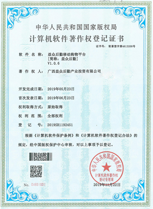 “益眾后勤移動(dòng)購(gòu)物平臺(tái)”即益眾后勤APP,是廣西益眾后勤產(chǎn)業(yè)投資有限公司與建設(shè)銀行百色分行聯(lián)合開(kāi)發(fā)的線上線下交易系統(tǒng)消費(fèi)者可以通過(guò)手機(jī)APP實(shí)現(xiàn)便捷消費(fèi)。該證書(shū)的獲得是我公司在互聯(lián)網(wǎng)自主研發(fā)創(chuàng)新及自主知識(shí)產(chǎn)權(quán)保護(hù)的重大突破,是益眾后勤網(wǎng)上商城在計(jì)算機(jī)軟件領(lǐng)域里得到的權(quán)威認(rèn)可,標(biāo)志著我公司在互聯(lián)網(wǎng)軟件研發(fā)應(yīng)用領(lǐng)域邁上了一個(gè)新的臺(tái)階。