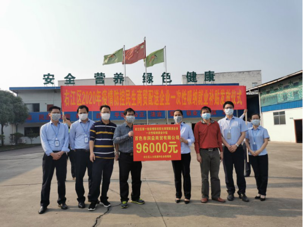 ??? 2020年2月29日,右江區(qū)人力資源和社會(huì)保障局黃彬副局長、就業(yè)服務(wù)中心黃瑞珉主任、右江區(qū)國有資產(chǎn)管理中心黃紹雷副主任,在潤益商貿(mào)公司舉行2020年疫情防控民生商貿(mào)配送企業(yè)一次性吸納就業(yè)補(bǔ)貼發(fā)放儀式。