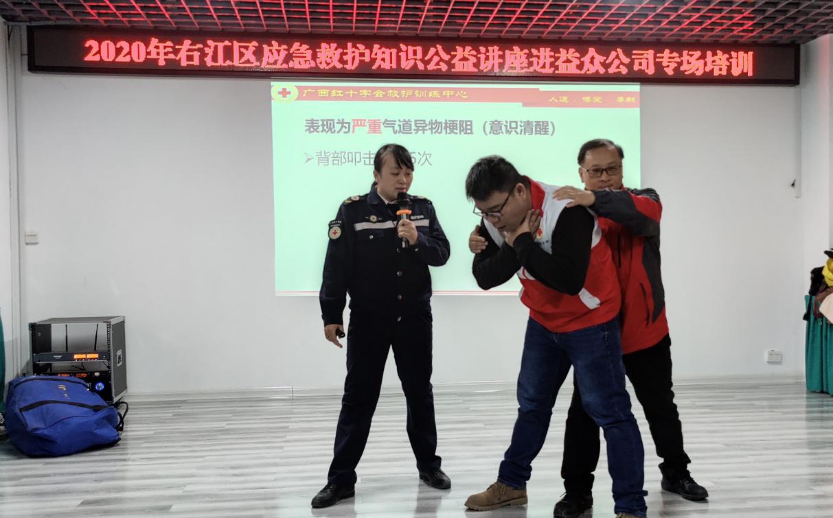 ????????為普及應(yīng)急救護知識,提高員工安全防范意識、自救互救能力和應(yīng)急救護技能,12月2日、6日,益眾公司邀請百色市右江區(qū)紅十字會到公司開展急救知識技能培訓(xùn),公司百余名管理人員、有關(guān)直屬班組400余人參加培訓(xùn)。