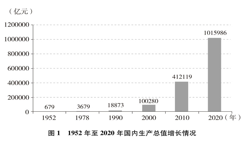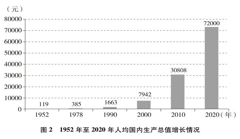 經(jīng)濟(jì)實(shí)力大幅提升。中國國內(nèi)生產(chǎn)總值從1952年的679.1億元躍升至2020年的101.6萬億元,經(jīng)濟(jì)總量占全球經(jīng)濟(jì)比重超過17%,穩(wěn)居世界第二大經(jīng)濟(jì)體(圖1)。人均國內(nèi)生產(chǎn)總值從1952年的幾十美元增至2020年的超過1萬美元,實(shí)現(xiàn)從低收入國家到中等偏上收入國家的歷史性跨越(圖2)。制造業(yè)增加值多年位居世界首位,220多種工業(yè)產(chǎn)品產(chǎn)量居世界第一,自2010年起連續(xù)11年位居世界第一制造業(yè)大國。中國已是全球貨物貿(mào)易第一大國、服務(wù)貿(mào)易第二大國、商品消費(fèi)第二大國、外匯儲(chǔ)備第一大國,2020年利用外資居全球第一。不斷邁向共同富裕的14億多人口,其中有超過4億并不斷擴(kuò)大的中等收入群體,是全球最具成長性的超大規(guī)模市場,中國經(jīng)濟(jì)充滿活力,具有巨大潛力和充足后勁。2020年,中國率先控制新冠肺炎疫情,率先復(fù)工復(fù)產(chǎn),率先實(shí)現(xiàn)經(jīng)濟(jì)增長由負(fù)轉(zhuǎn)正,充分彰顯中國經(jīng)濟(jì)的強(qiáng)勁韌性。