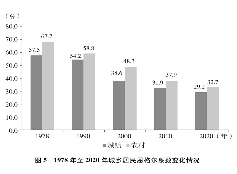 人民生活水平顯著提高。居民收入持續(xù)增加,全國居民人均年可支配收入從1978年的171元增加到2020年的32189元(圖4)。城鄉(xiāng)居民恩格爾系數(shù)分別從1978年的57.5%、67.7%下降到2020年的29.2%、32.7%(圖5),城鄉(xiāng)居民生活質(zhì)量不斷提升。溫飽問題解決后,人們對生活品質(zhì)、品位有了更高的追求,衣食住行不斷升級(jí),消費(fèi)結(jié)構(gòu)從生存型逐漸向發(fā)展型、享受型過渡。衣,從穿暖到穿美、穿出時(shí)尚;食,從吃飽到吃好、吃出健康;住,從有所居到更敞亮、更宜居;行,從便利通暢到快捷舒適。吃穿用有余,家電全面普及,乘用汽車快速進(jìn)入尋常百姓家。餐飲、健康、教育、旅游、文娛等服務(wù)性消費(fèi)持續(xù)快速增長,在居民人均消費(fèi)支出中占比逐漸達(dá)到一半左右。越來越多的人有“錢”有“閑”,“詩和遠(yuǎn)方”更加觸手可及,“說走就走”不再是夢想,旅游扮靚人們的幸福生活,中國正在進(jìn)入大眾旅游時(shí)代。