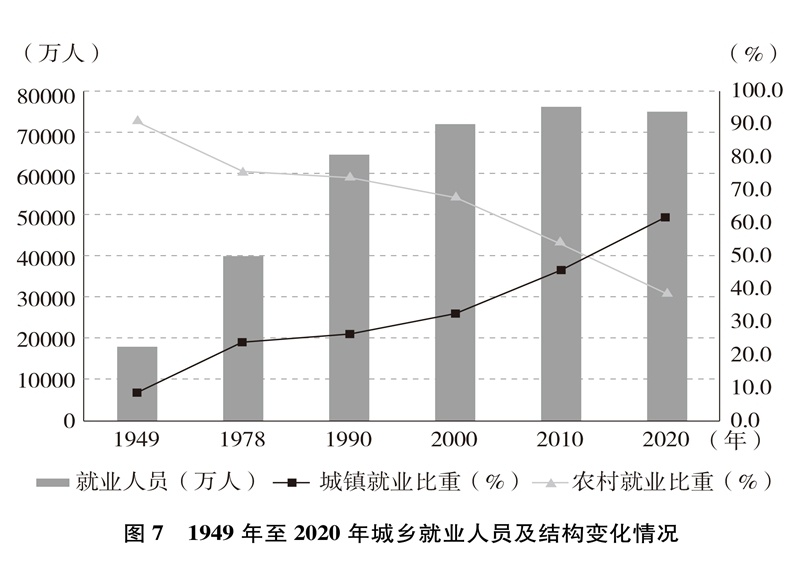 就業(yè)局勢長期穩(wěn)定,就業(yè)質(zhì)量顯著提升。就業(yè)人數(shù)從1949年的1.8億增加到2020年的7.5億,就業(yè)規(guī)模不斷擴(kuò)大;從絕大多數(shù)勞動(dòng)者以農(nóng)業(yè)為生到第三產(chǎn)業(yè)就業(yè)人數(shù)占47.7%(圖6)、城鎮(zhèn)就業(yè)人數(shù)占61.6%(圖7),就業(yè)結(jié)構(gòu)不斷優(yōu)化;從勞動(dòng)者普遍處于文盲半文盲狀態(tài)到勞動(dòng)年齡人口平均受教育年限10.8年、技能人才總量約2億,就業(yè)人員素質(zhì)大幅提高。億萬勞動(dòng)者擁有自己熱愛的工作,開啟幸福生活的大門。從計(jì)劃分配到市場就業(yè)、自由擇業(yè)、自主創(chuàng)業(yè),從傳統(tǒng)就業(yè)方式到新就業(yè)形態(tài),勞動(dòng)者的就業(yè)觀念深刻變革、就業(yè)空間更加廣闊、就業(yè)方式日益多元。人們的興趣愛好、特長稟賦與個(gè)人就業(yè)意愿、社會(huì)需求、國家需要更好結(jié)合,自我價(jià)值更好實(shí)現(xiàn),主動(dòng)性創(chuàng)造性顯著增強(qiáng),創(chuàng)新創(chuàng)造熱情不斷迸發(fā)。勞動(dòng)者合法權(quán)益得到保障,勞動(dòng)報(bào)酬保持增長,勞動(dòng)所得受到保護(hù),人們越來越有尊嚴(yán)地勞動(dòng)、快樂地勞動(dòng),依靠自己的雙手創(chuàng)造美好生活。從“單休制”到“雙休制”,從“黃金周”到帶薪年休假,勞動(dòng)者休息休假權(quán)益越來越有保障,工作生活更加平衡。勞動(dòng)最光榮、最崇高、最偉大、最美麗日益成為全社會(huì)的共識(shí)和行動(dòng),勤奮做事、勤勉為人、勤勞致富成為風(fēng)尚,崇尚勞動(dòng)、尊重勞動(dòng)、熱愛勞動(dòng)的社會(huì)氛圍更加濃厚。