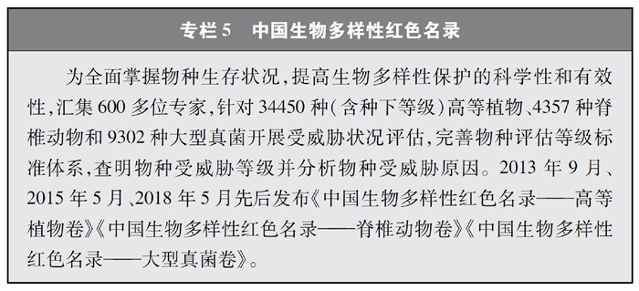 開展全國生物多樣性調(diào)查與評估。大力推進生物多樣性保護重大工程實施,結(jié)合自然資源調(diào)查、生態(tài)系統(tǒng)監(jiān)測評估等工作,不斷完善生物多樣性調(diào)查與評估能力,首次將生物多樣性指標(biāo)納入生態(tài)質(zhì)量綜合評價指標(biāo)體系,引導(dǎo)地方加強生態(tài)文明建設(shè)與生物多樣性保護。開展自然資源調(diào)查,包括森林、草原、水、濕地、荒漠、海洋等,建立自然資源調(diào)查評價監(jiān)測制度。構(gòu)建了涵蓋2376個縣級行政單元、樣線總長超過3.4萬公里的物種分布數(shù)據(jù)庫,建立物種資源調(diào)查及收集信息平臺,準(zhǔn)確反映野生動植物空間分布狀況。完成長江經(jīng)濟帶、京津冀等國家戰(zhàn)略區(qū)域180多個縣級行政區(qū)生物多樣性調(diào)查與評估。組織開展近海漁業(yè)資源調(diào)查,初步掌握近海漁業(yè)資源狀況。陸續(xù)發(fā)布《中國植物紅皮書》《中國瀕危動物紅皮書》《中國物種紅色名錄》《中國生物多樣性紅色名錄》,基本掌握生物多樣性總體情況,為加強生物多樣性保護奠定了科學(xué)基礎(chǔ)。