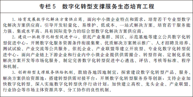 (四)培育轉(zhuǎn)型支撐服務(wù)生態(tài)。建立市場(chǎng)化服務(wù)與公共服務(wù)雙輪驅(qū)動(dòng),技術(shù)、資本、人才、數(shù)據(jù)等多要素支撐的數(shù)字化轉(zhuǎn)型服務(wù)生態(tài),解決企業(yè)“不會(huì)轉(zhuǎn)”“不能轉(zhuǎn)”“不敢轉(zhuǎn)”的難題。面向重點(diǎn)行業(yè)和企業(yè)轉(zhuǎn)型需求,培育推廣一批數(shù)字化解決方案。聚焦轉(zhuǎn)型咨詢(xún)、標(biāo)準(zhǔn)制定、測(cè)試評(píng)估等方向,培育一批第三方專(zhuān)業(yè)化服務(wù)機(jī)構(gòu),提升數(shù)字化轉(zhuǎn)型服務(wù)市場(chǎng)規(guī)模和活力。支持高校、龍頭企業(yè)、行業(yè)協(xié)會(huì)等加強(qiáng)協(xié)同,建設(shè)綜合測(cè)試驗(yàn)證環(huán)境,加強(qiáng)產(chǎn)業(yè)共性解決方案供給。建設(shè)數(shù)字化轉(zhuǎn)型促進(jìn)中心,銜接集聚各類(lèi)資源條件,提供數(shù)字化轉(zhuǎn)型公共服務(wù),打造區(qū)域產(chǎn)業(yè)數(shù)字化創(chuàng)新綜合體,帶動(dòng)傳統(tǒng)產(chǎn)業(yè)數(shù)字化轉(zhuǎn)型。