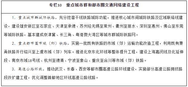 強化重點城市群城際交通建設。圍繞京津冀、長三角、粵港澳大灣區(qū)、成渝、長江中游等城市群,以軌道交通、高速公路為骨干,提升城際運輸通道功能,加強核心城市快速直連,構(gòu)建多節(jié)點、網(wǎng)絡化的城際交通網(wǎng),實現(xiàn)城市群內(nèi)主要城市間2小時通達。整體推進京津冀、長三角、粵港澳大灣區(qū)城際鐵路和市域(郊)鐵路建設,有序推動成渝地區(qū)雙城經(jīng)濟圈城際鐵路和市域(郊)鐵路建設,加強與高速鐵路、普速鐵路一體銜接,擴大對5萬人口以上城鎮(zhèn)的有效覆蓋。
