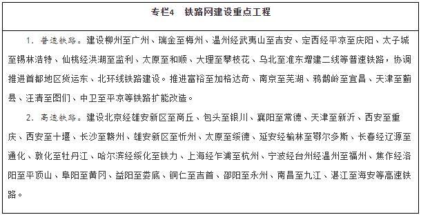 建設現(xiàn)代化鐵路網(wǎng)。堅持客貨并重、新建改建并舉、高速普速協(xié)調(diào)發(fā)展,加快普速鐵路建設和既有鐵路擴能改造,著力消除干線瓶頸,推進既有鐵路運能緊張路段能力補強,加快提高中西部地區(qū)鐵路網(wǎng)覆蓋水平。加強資源富集區(qū)、人口相對密集脫貧地區(qū)的開發(fā)性鐵路和支線鐵路建設。推進高速鐵路主通道建設,提升沿江、沿海、呼南、京昆等重要通道以及京滬高鐵輔助通道運輸能力,有序建設區(qū)域連接線。綜合運用新技術(shù)手段,改革創(chuàng)新經(jīng)營管理模式,提高鐵路網(wǎng)整體運營效率。統(tǒng)籌考慮運輸需求和效益,合理規(guī)劃建設鐵路項目,嚴控高速鐵路平行線路建設。
