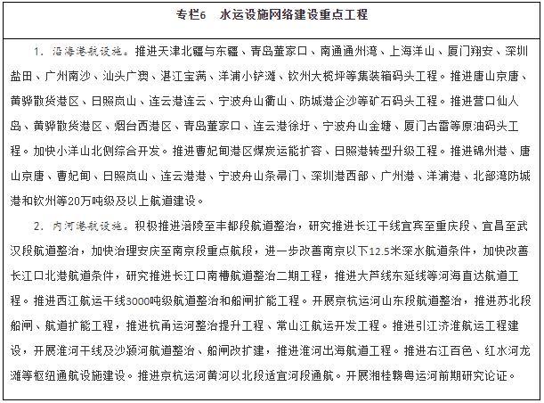 優(yōu)化暢通水運設施網(wǎng)絡。建設京津冀、長三角、粵港澳大灣區(qū)世界級港口群,支持山東打造世界一流的海洋港口,推進東北地區(qū)沿海港口一體化發(fā)展,優(yōu)化港口功能布局,推動資源整合和共享共用。有序推進沿海港口專業(yè)化碼頭及進出港航道等公共設施建設。適度超前建設糧食、能源、礦產(chǎn)資源的接卸、儲存、中轉(zhuǎn)設施,推進沿海沿江液化天然氣碼頭規(guī)劃建設。提升內(nèi)河港口專業(yè)化、規(guī)模化水平,合理集中布局集裝箱、煤炭、鐵礦石、商品汽車等專業(yè)化碼頭。加強內(nèi)河高等級航道擴能升級與暢通攻堅建設,完善長江、珠江、京杭運河和淮河等水系內(nèi)河高等級航道網(wǎng)絡,進一步提升珠三角高等級航道網(wǎng)出海能力,全面加強長三角、珠江—西江高等級航道網(wǎng)未達標段建設。推動重要支流航道和庫湖區(qū)航道、內(nèi)河旅游航道、便民碼頭建設。