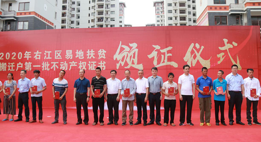 5月16日上午,右江區(qū)“老鄉(xiāng)家園—迎龍易地扶貧搬遷安置小鎮(zhèn)”搬遷戶不動產(chǎn)權證書頒證儀式在安置小鎮(zhèn)舉行,第一批26戶搬遷戶順利拿到了產(chǎn)權證書。百色市發(fā)改委副主任、市水庫和扶貧易地安置管理局局長羅加攀,右江區(qū)委常委、區(qū)人民政府副區(qū)長岑萬興,右江區(qū)委常委、宣傳部部長、區(qū)人民政府副區(qū)長王世凡,右江區(qū)委常委、辦公室主任盧靈及右江區(qū)直單位、鄉(xiāng)鎮(zhèn)代表,廣西百色益眾投資有限公司董事長、總經(jīng)理趙家臣出席儀式。儀式由王世凡主持。