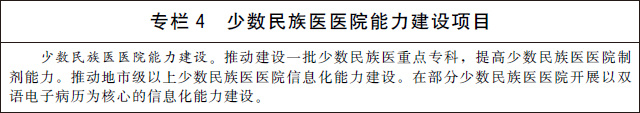 3.發(fā)展少數(shù)民族醫(yī)藥。加強少數(shù)民族醫(yī)醫(yī)療機構(gòu)建設(shè),提高民族地區(qū)基層醫(yī)療衛(wèi)生機構(gòu)少數(shù)民族醫(yī)藥服務(wù)能力。改善少數(shù)民族醫(yī)醫(yī)院基礎(chǔ)設(shè)施條件,加強少數(shù)民族醫(yī)醫(yī)院專科能力、制劑能力和信息化能力建設(shè)。建立符合少數(shù)民族醫(yī)醫(yī)療機構(gòu)自身特點和發(fā)展規(guī)律的績效評價指標(biāo)體系。加大少數(shù)民族醫(yī)藥防治重大疾病和優(yōu)勢病種研究力度,有效傳承特色診療技術(shù)和方法。鼓勵和扶持少數(shù)民族醫(yī)藥院校教育、師承教育和繼續(xù)教育。加大對少數(shù)民族醫(yī)藥的傳承保護力度,持續(xù)開展少數(shù)民族醫(yī)藥文獻(xiàn)搶救整理工作,推動理論創(chuàng)新和技術(shù)創(chuàng)新。